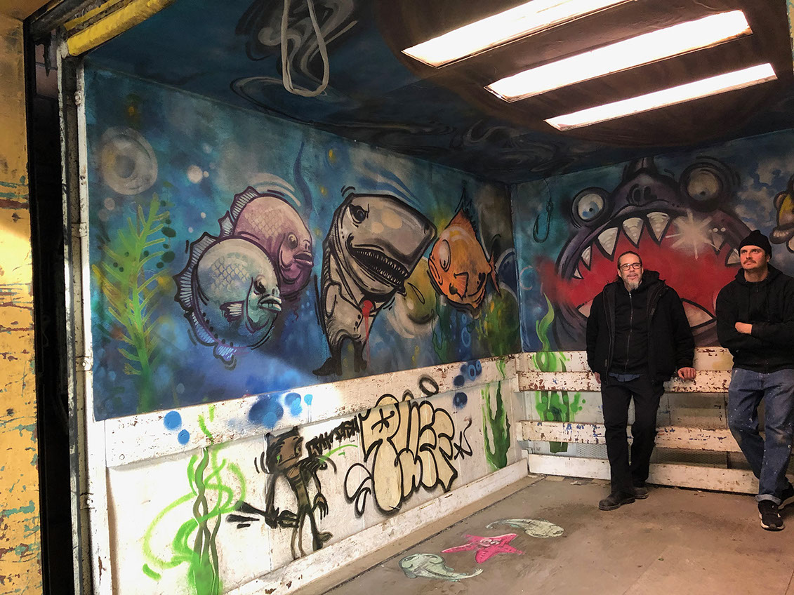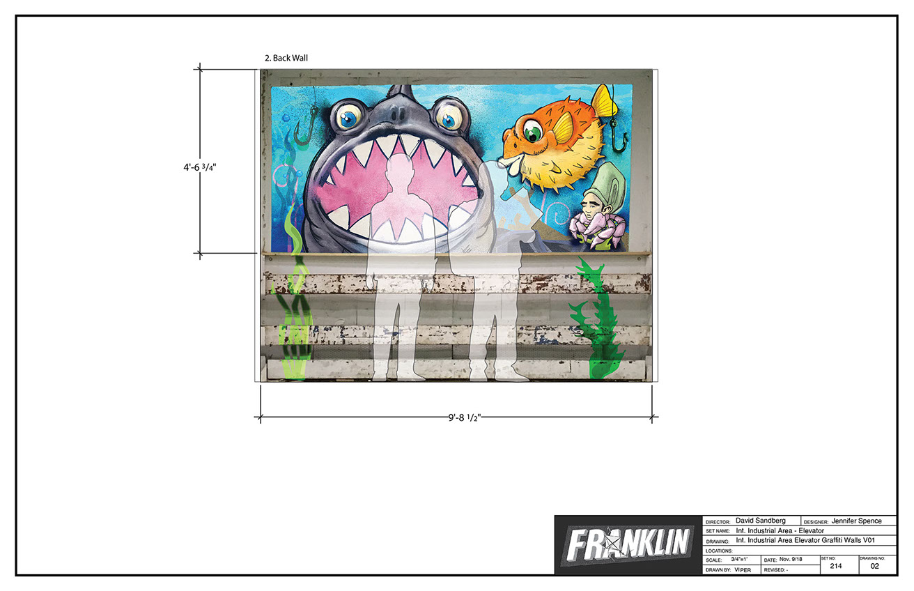 Final graphic treated with spray paint by scenic dept.
