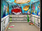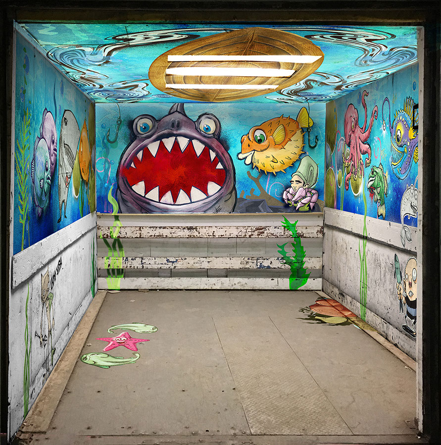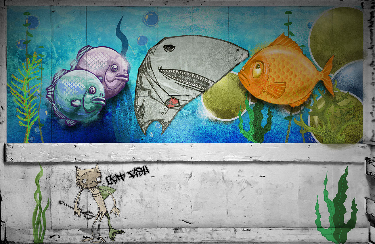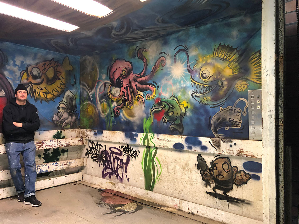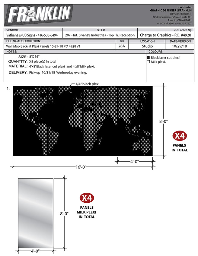 Final graphic treated with spray paint by scenic dept.